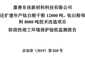 公?? 示??? 根據(jù)《國務院關(guān)于修改〈建設項目竣工環(huán)境保護管理條例〉的決定》(國務院令第682號),以及環(huán)保部《關(guān)于發(fā)布的公告》(國環(huán)規(guī)環(huán)評[2017]4號),現(xiàn)將嘉善東佳新材料科技有限公司遷擴建年產(chǎn)鈦白粉干粉12000噸,鈦白粉母料8000噸技術(shù)改造項目階段性竣工環(huán)境保護